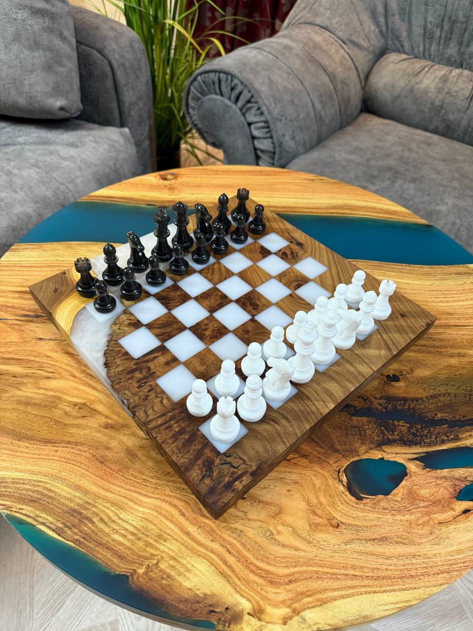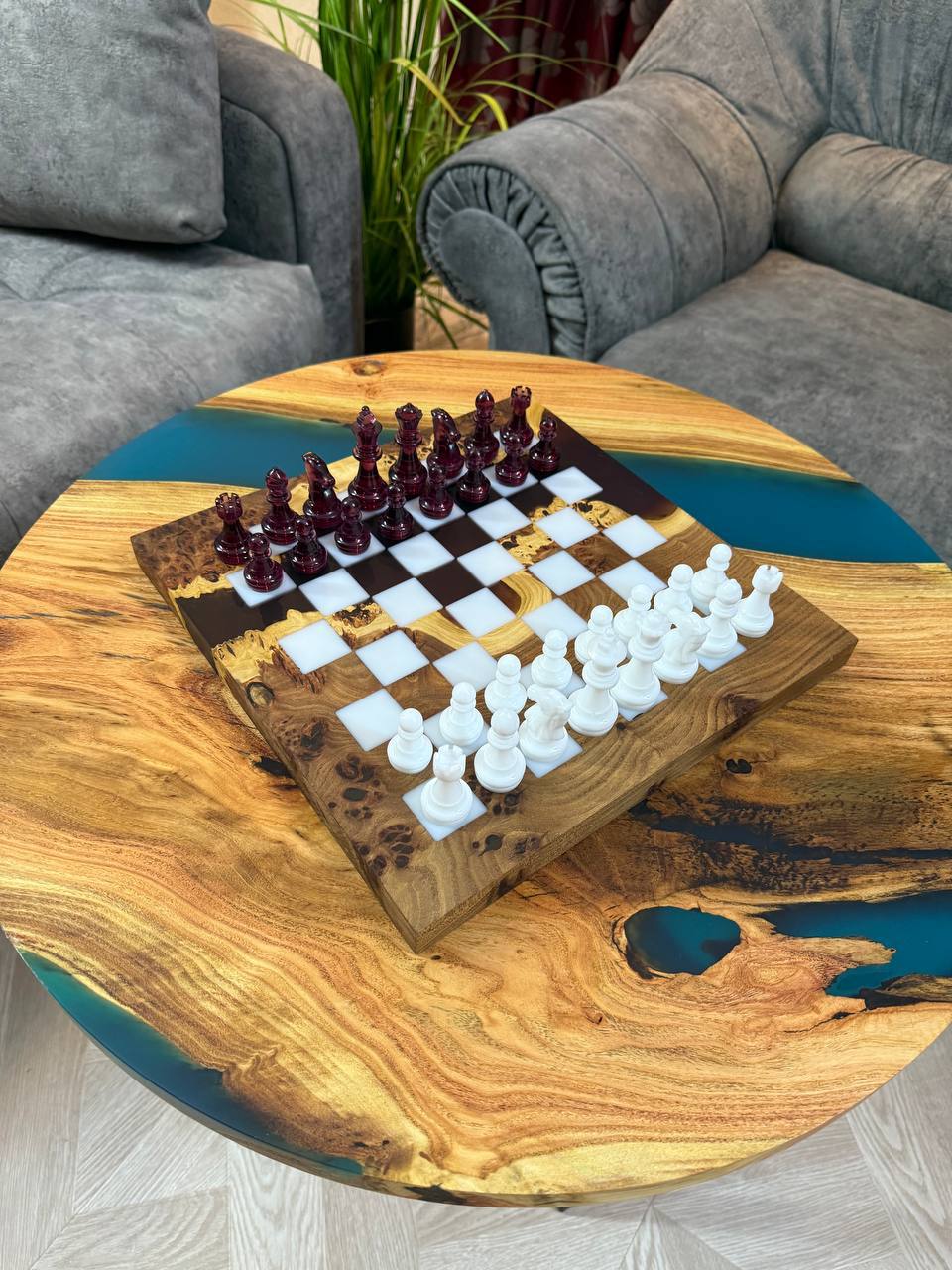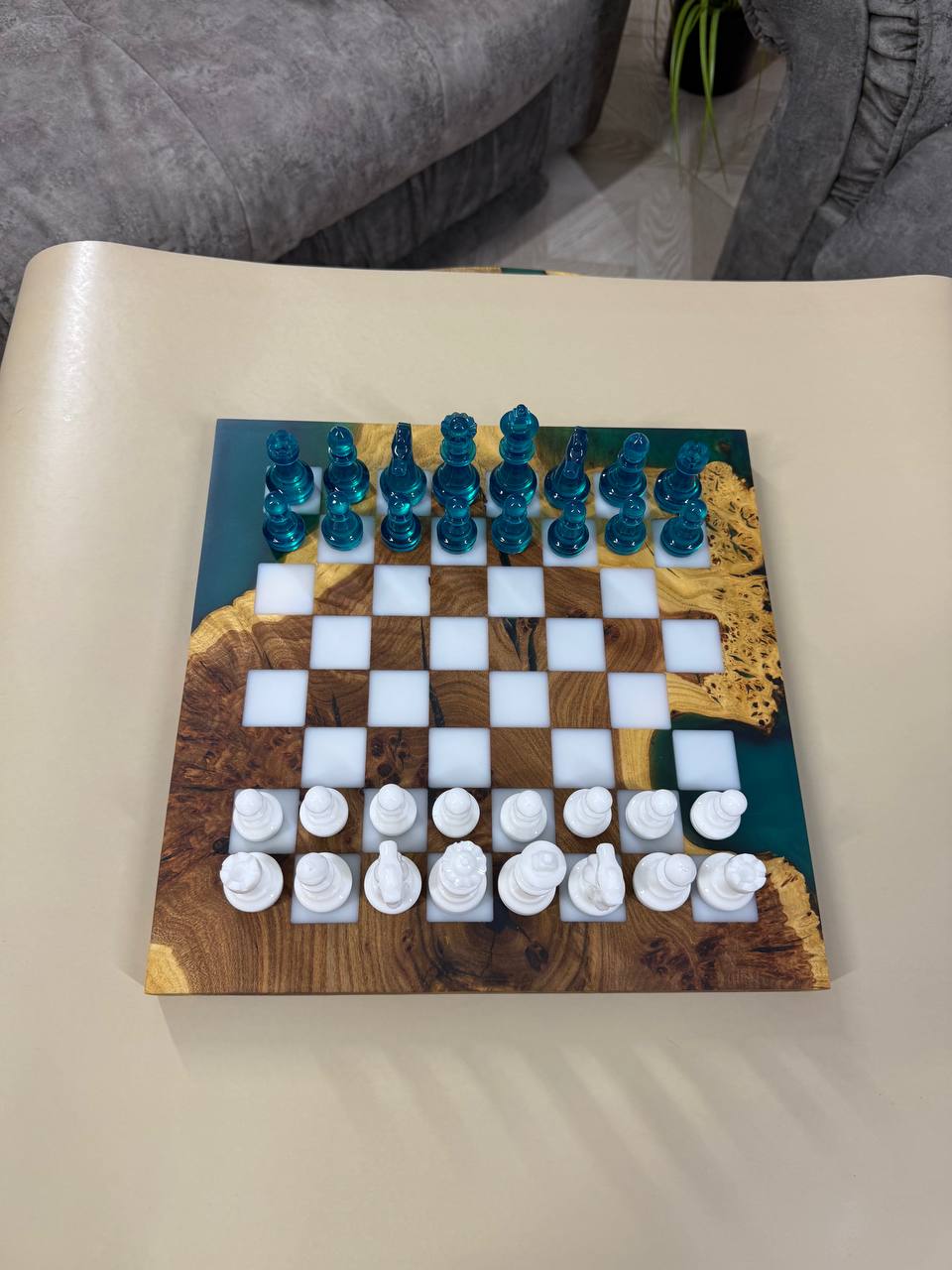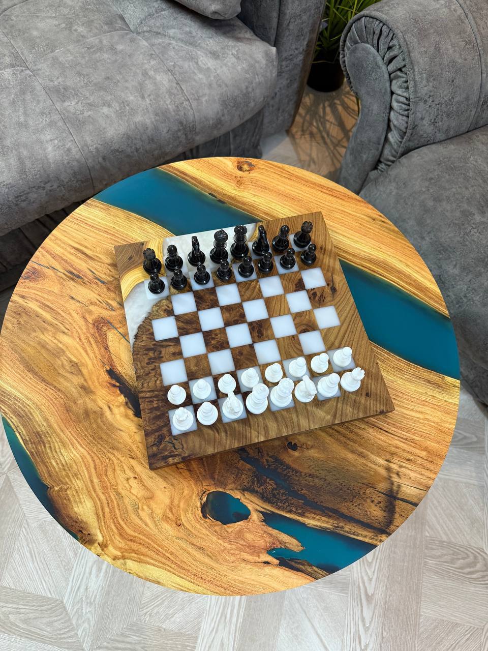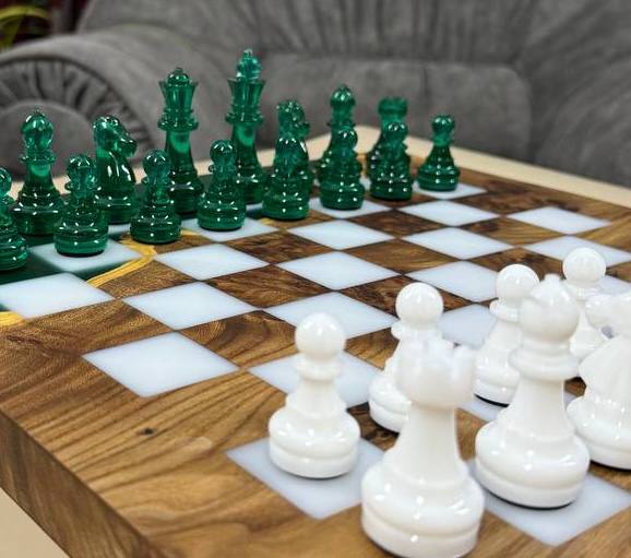 Особенности: - Эпоксидная смола цвета морской волны - Доска покрыта качественным масло-воском. - На каждой фигурке кожаное основание, для защиты доски от царапин.