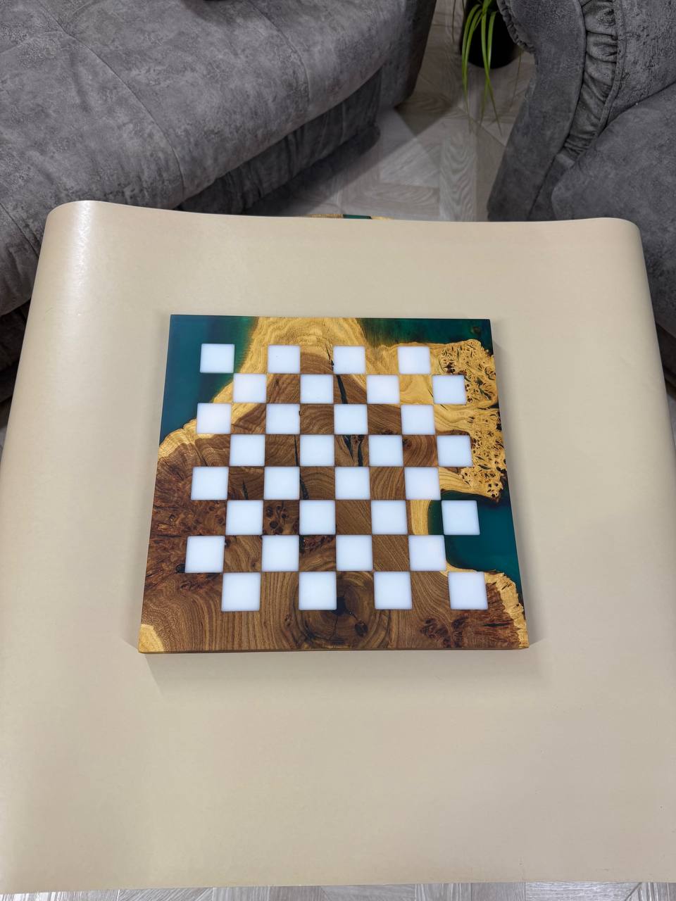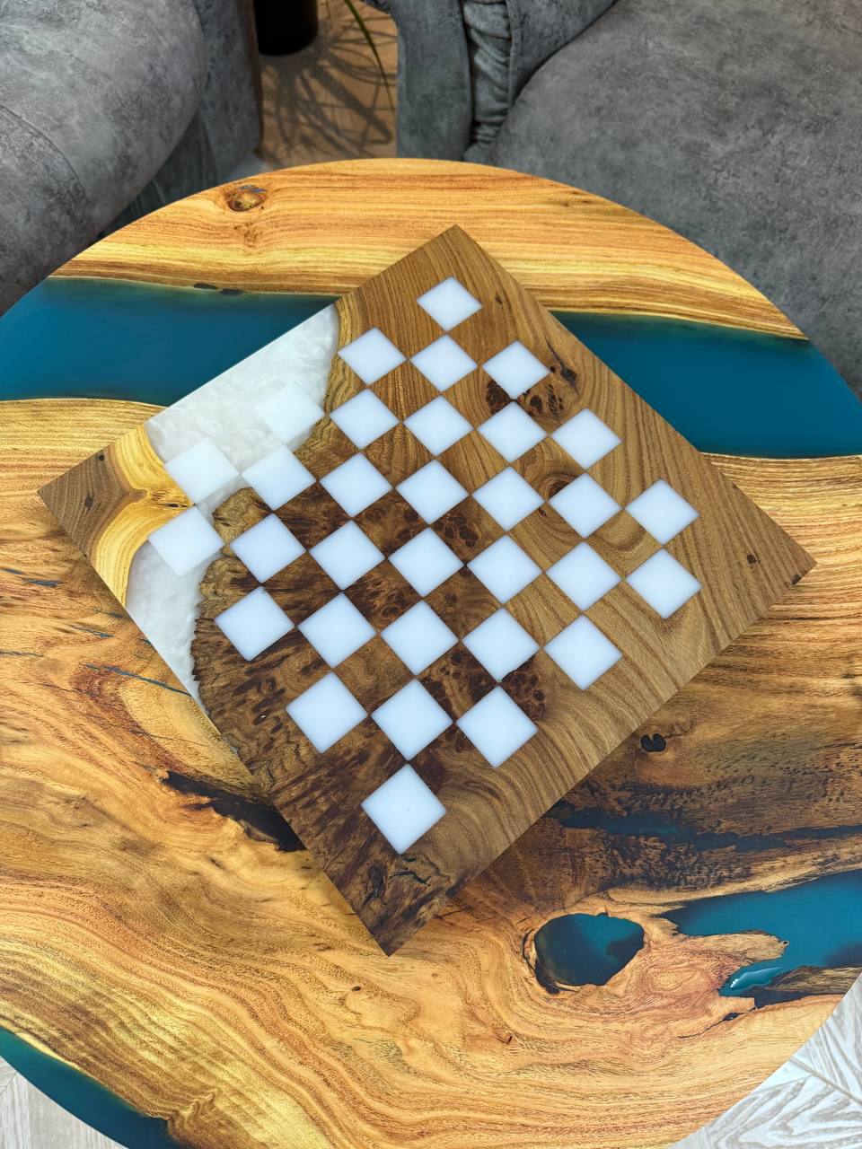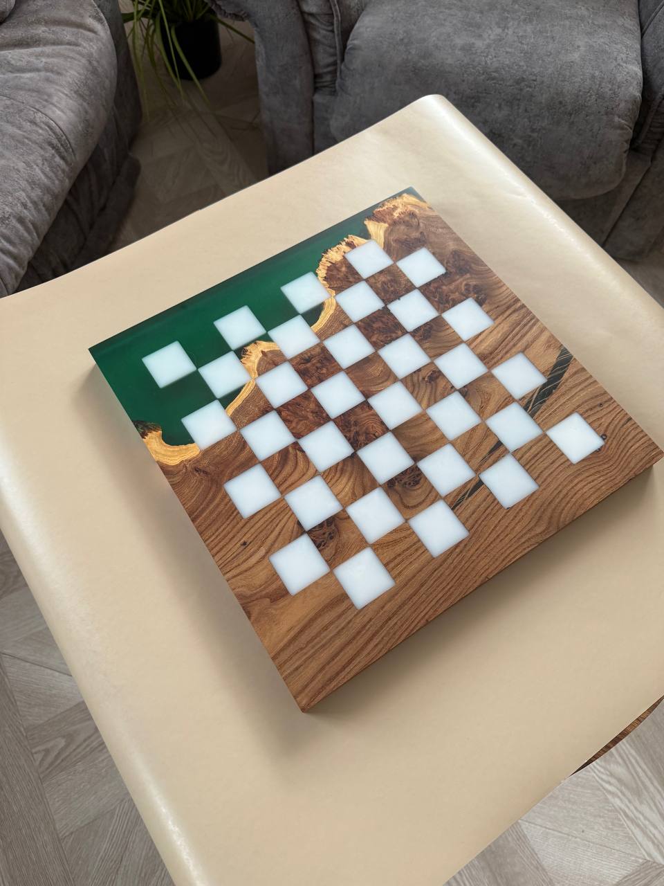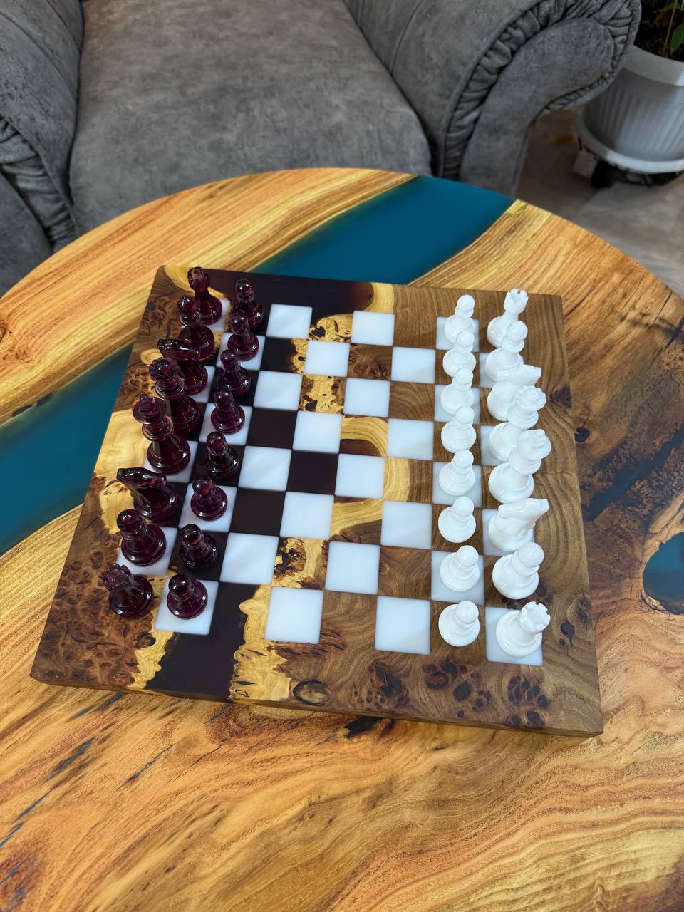 Особенности: - Эпоксидная смола цвета морской волны - Доска покрыта качественным масло-воском. - На каждой фигурке кожаное основание, для защиты доски от царапин.
