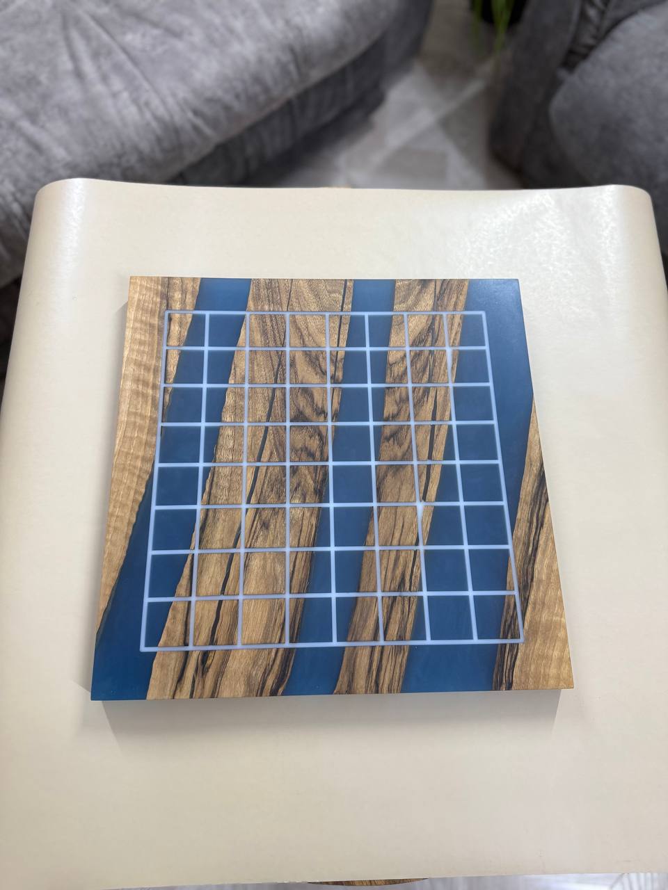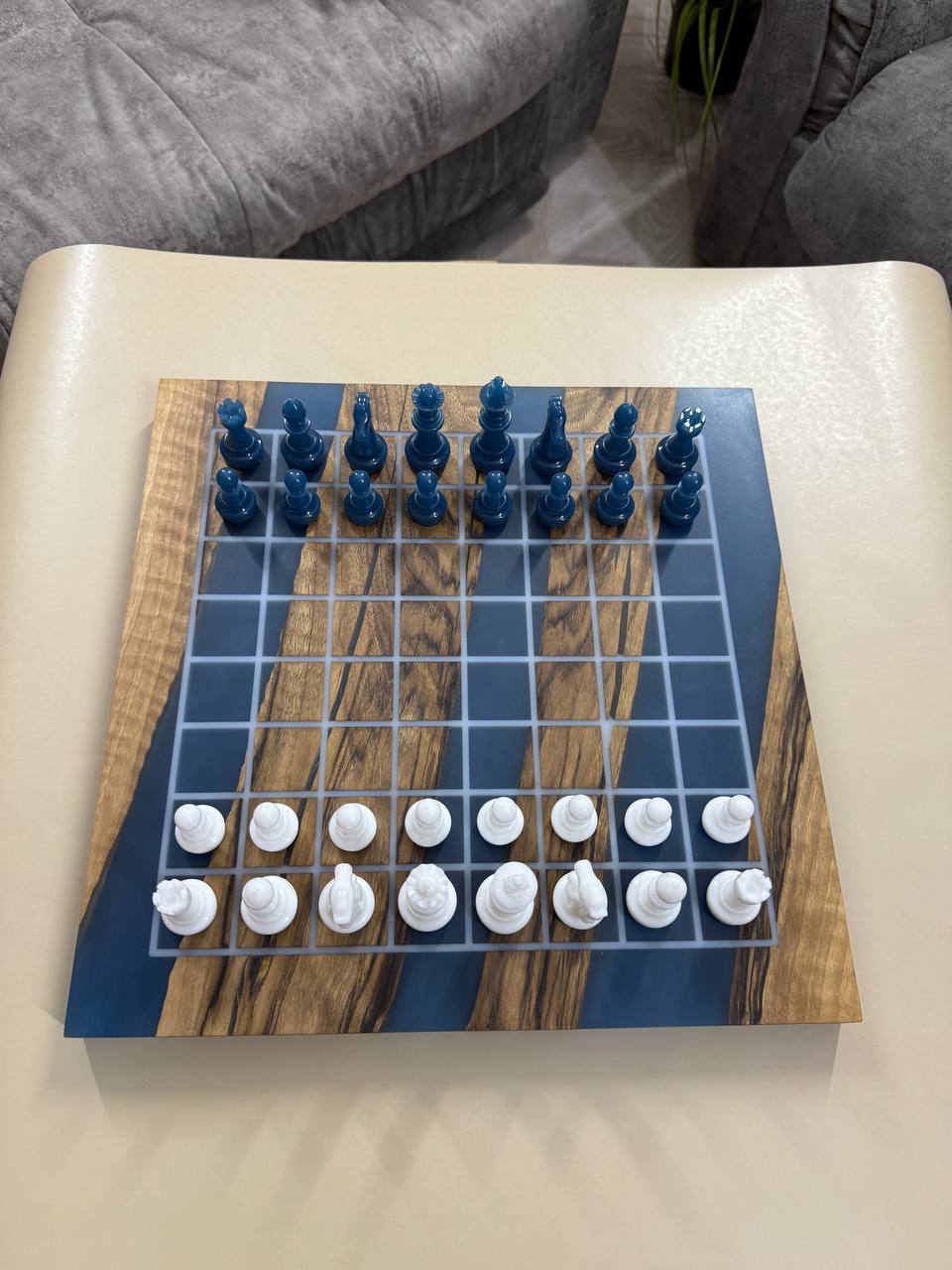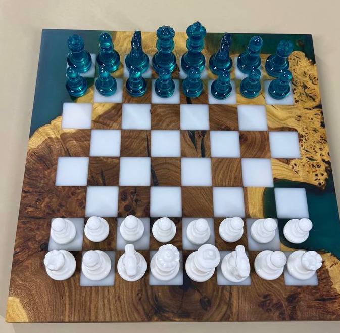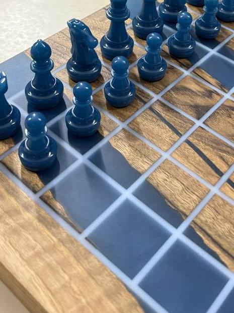 Особенности: - Эпоксидная смола нежно синего цвета цвета - Доска покрыта качественным масло-воском. - На каждой фигурке кожаное основание, для защиты доски от царапин.