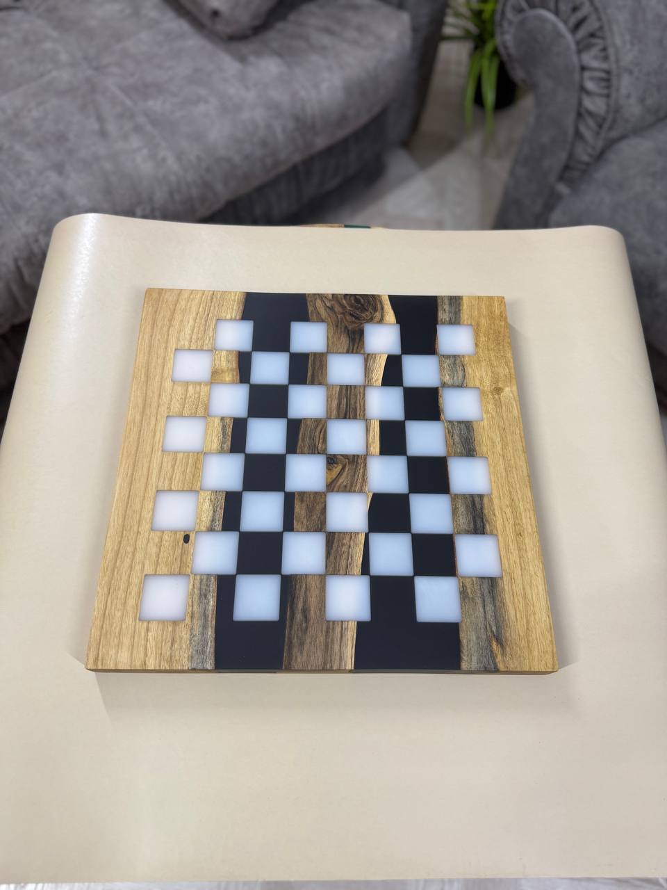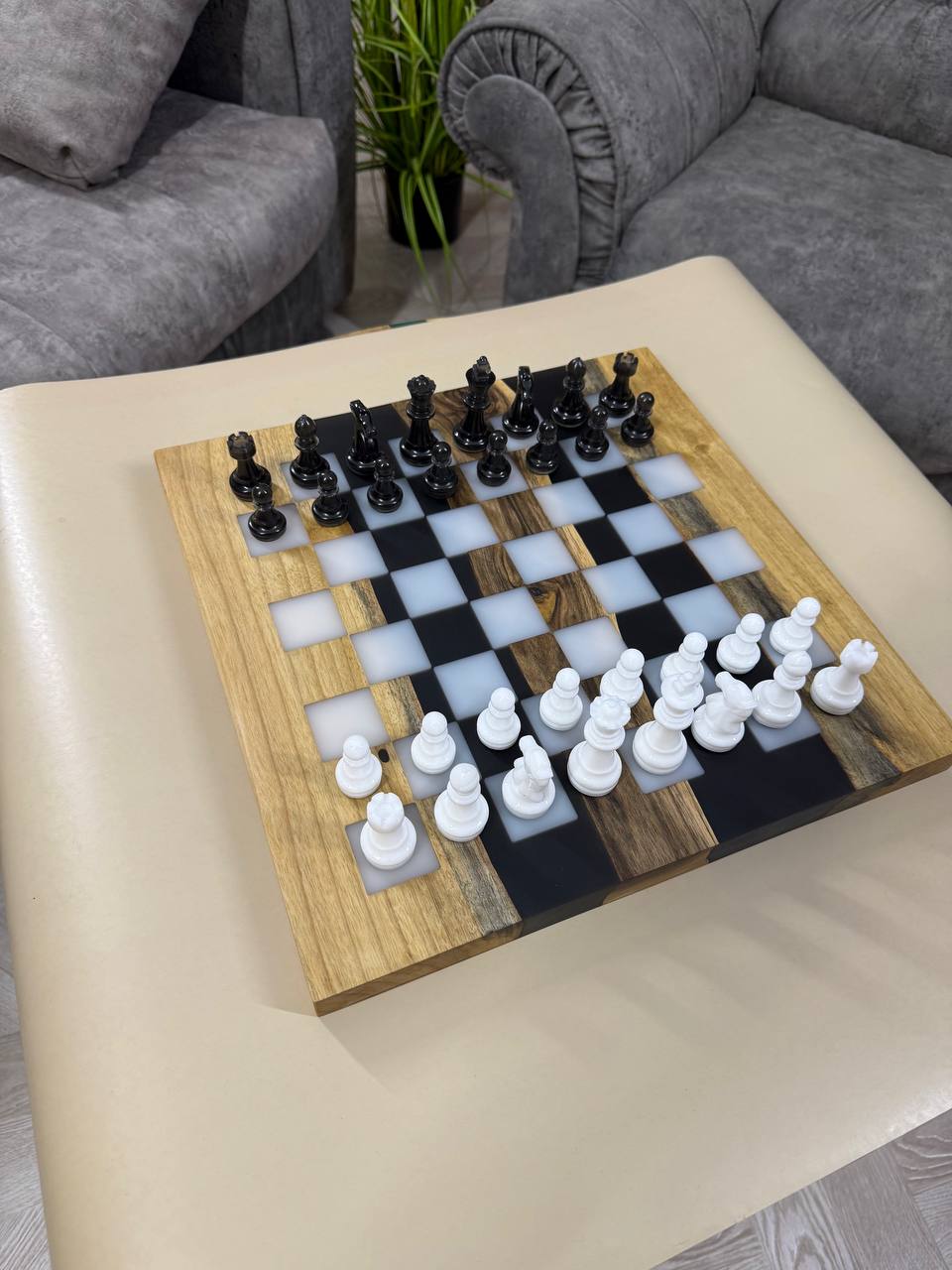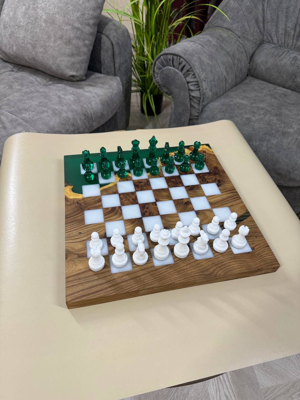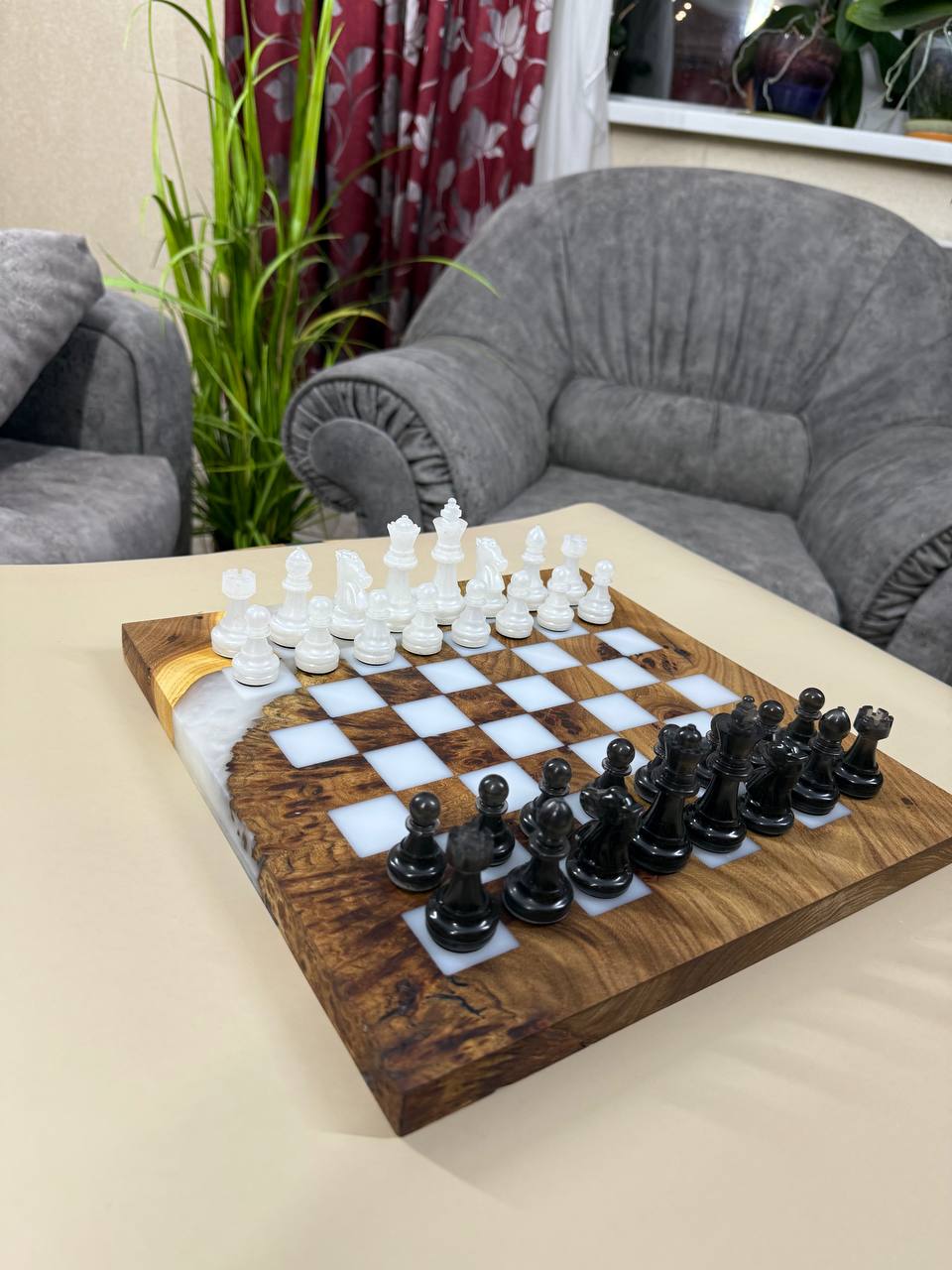 Особенности: - Эпоксидная смола кремового цвета - Доска покрыта качественным масло-воском. - На каждой фигурке кожаное основание, для защиты доски от царапин.