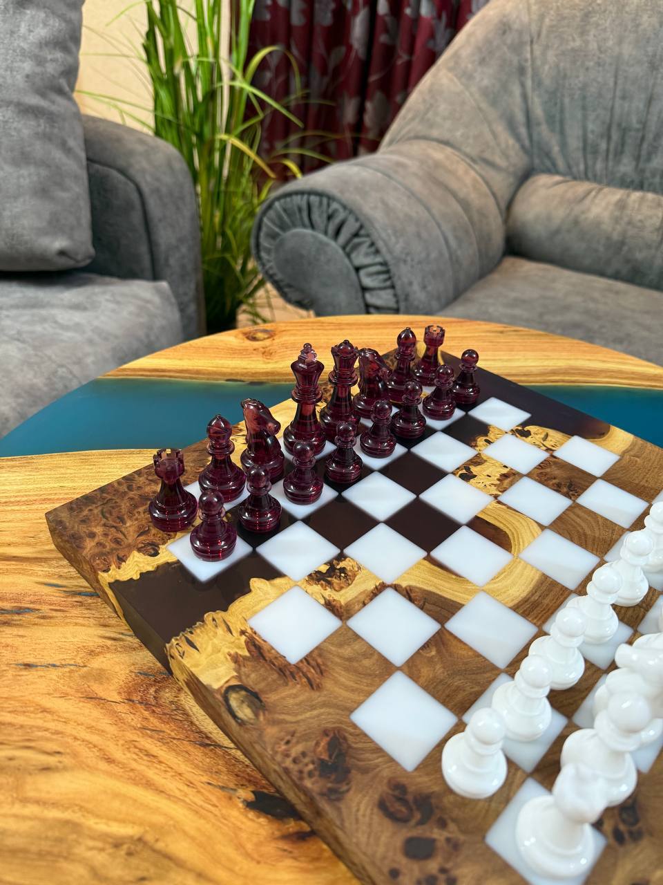 Особенности: - Эпоксидная смола рубинового цвета - Доска покрыта качественным масло-воском. - На каждой фигурке кожаное основание, для защиты доски от царапин.