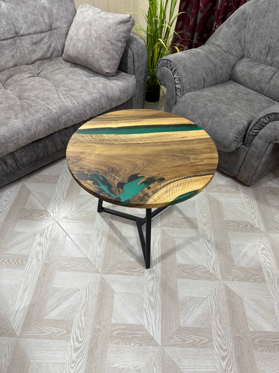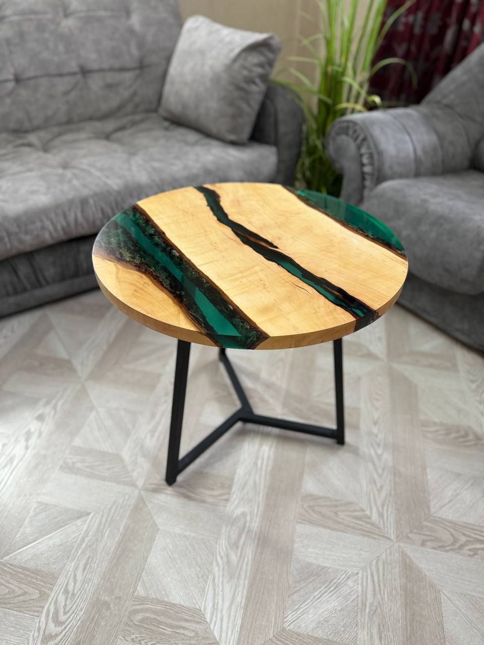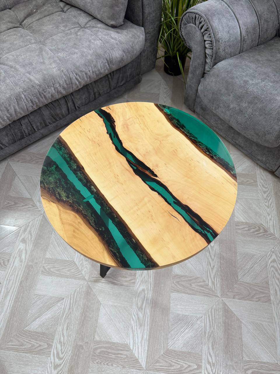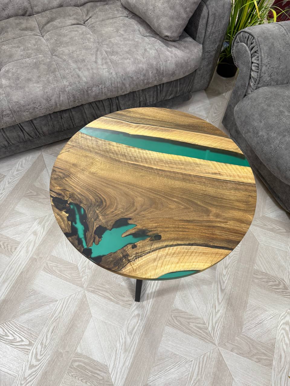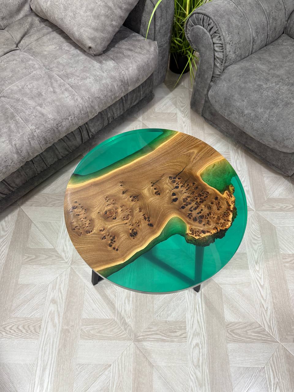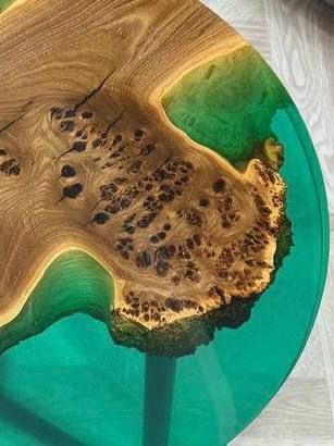 Каждый столик абсолютно уникален, поскольку природа сама диктует свои узоры, и ни одно изделие не повторяется. - Эпоксидная смола изумрудного цвета.