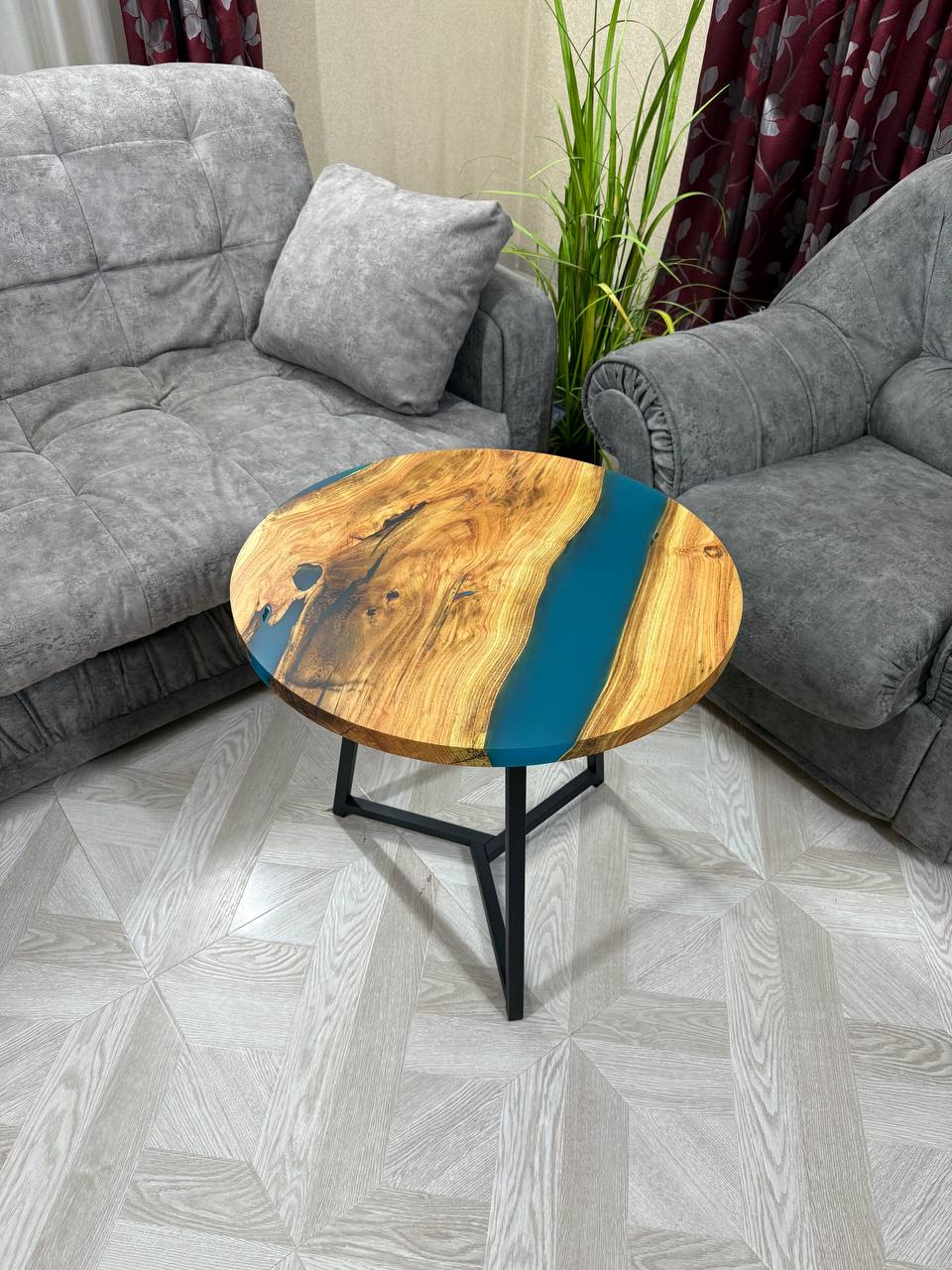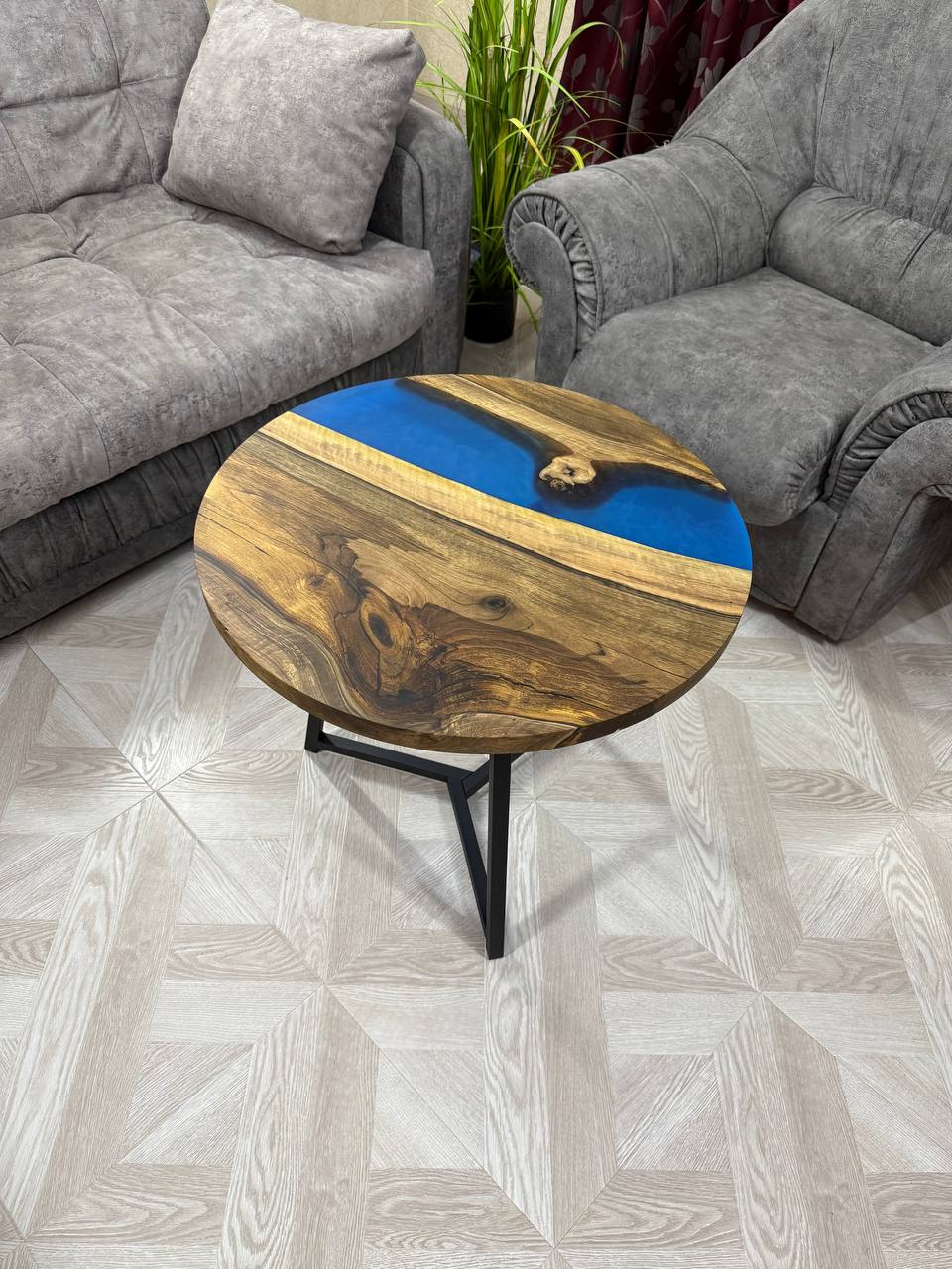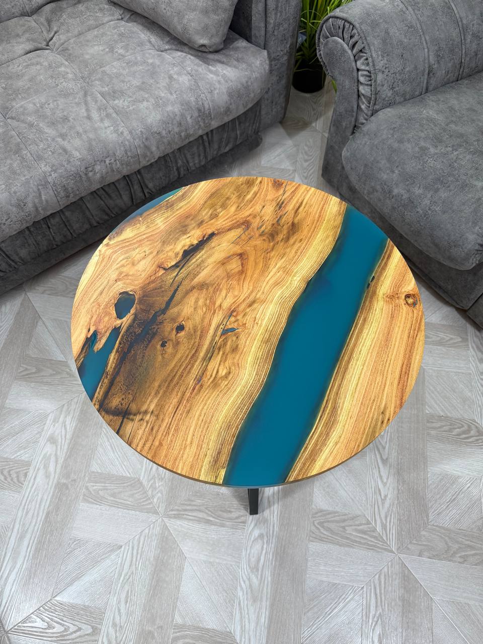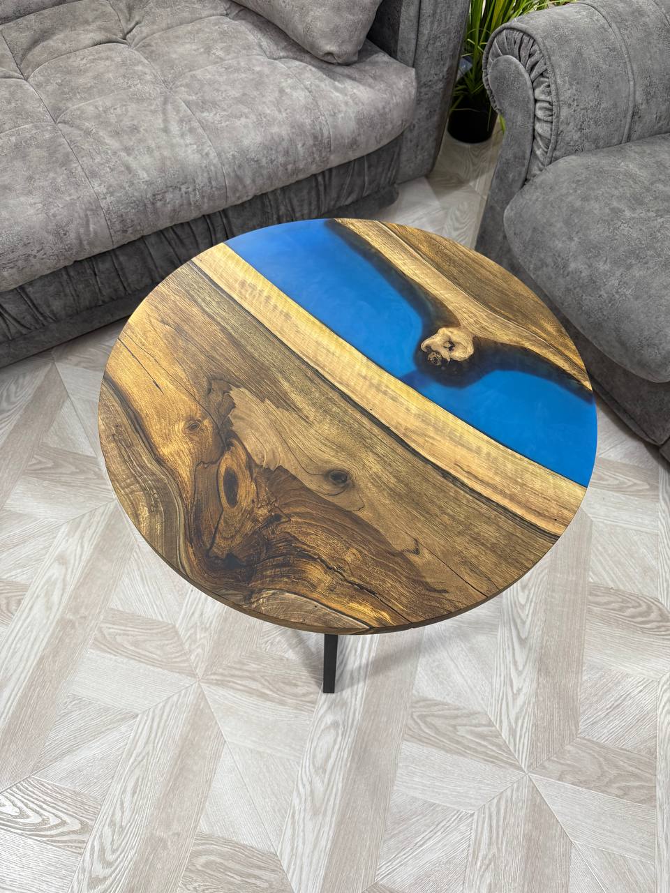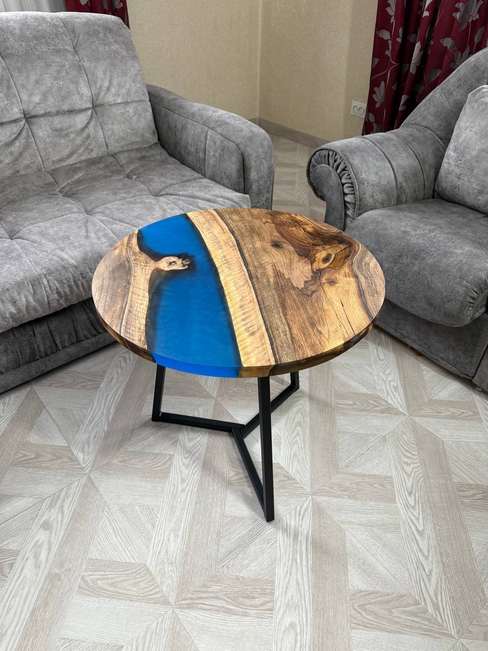 Каждый столик абсолютно уникален, поскольку природа сама диктует свои узоры, и ни одно изделие не повторяется. - Эпоксидная смола нежно голубого цвета.
