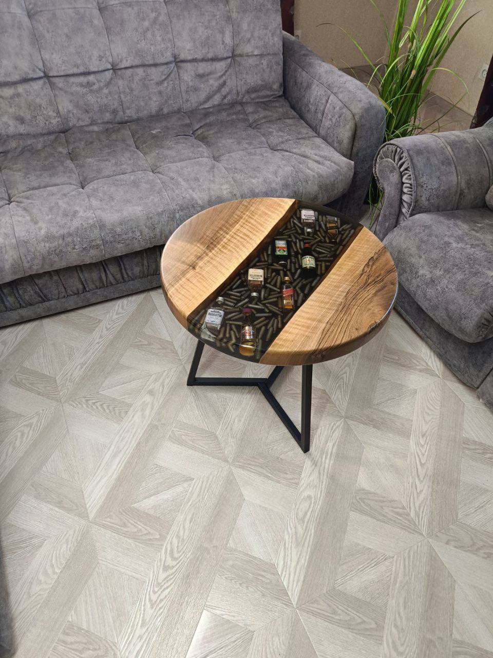 В центре стола находятся бутылки с алкоголем и гильзами, заключенные в прозрачную эпоксидную смолу, создавая эффект застывшего времени и добавляя нотку роскоши и изысканности.