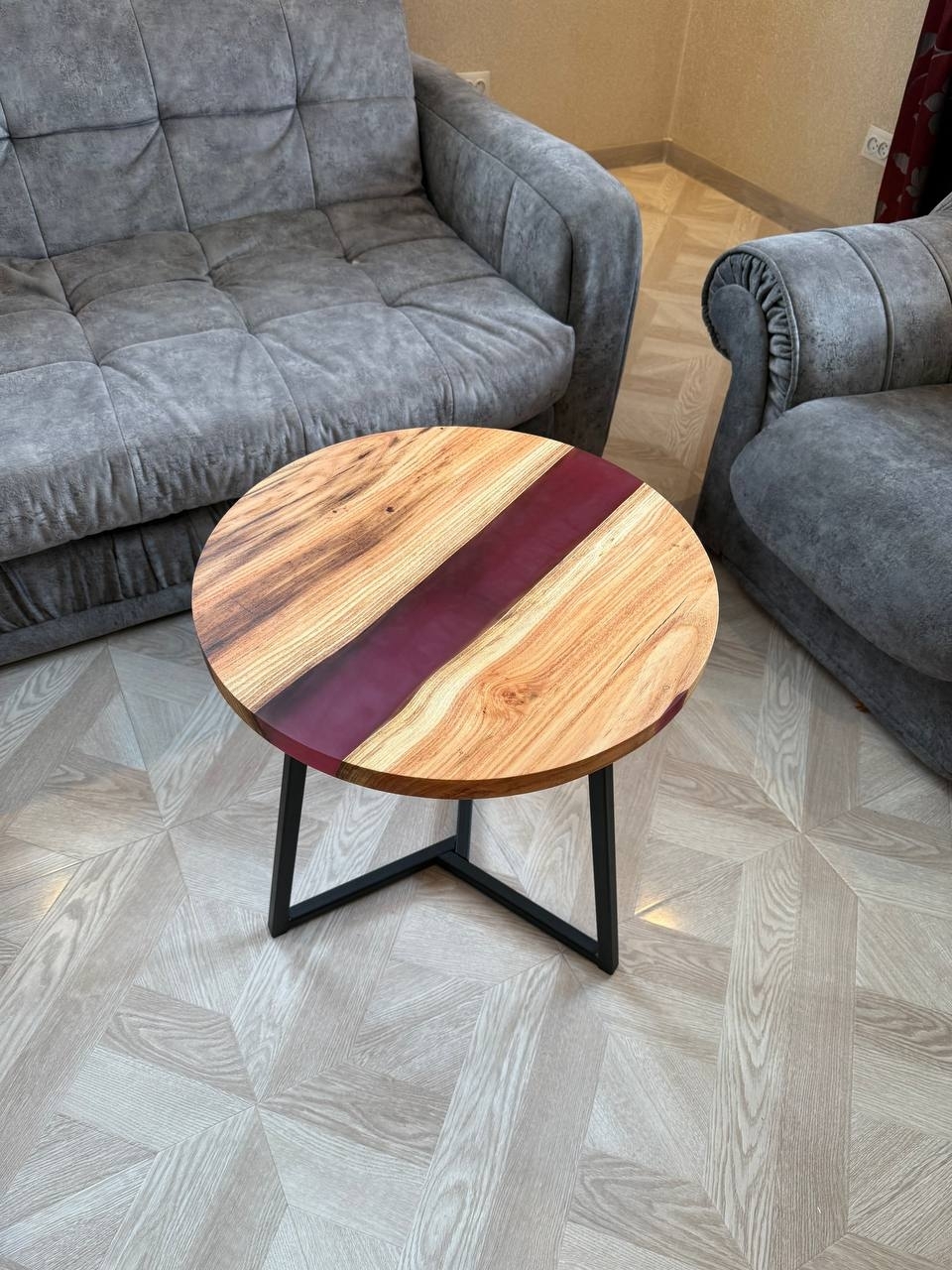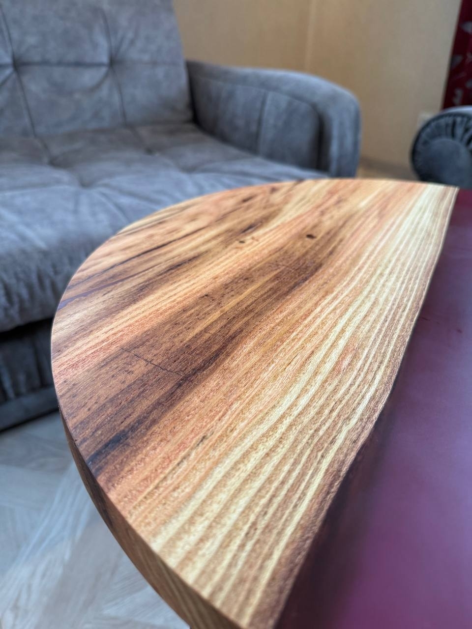 Этот стильный журнальный стол выполнен из массива граба, отличающегося высокой прочностью и красивой текстурой. В оформлении используется полупрозрачная эпоксидная смола, создающая уникальные узоры и визуально расширяя пространство. Стол покрыт глянцевым лаком, который подчеркивает натуральный рисунок дерева и придает поверхности гладкость и блеск