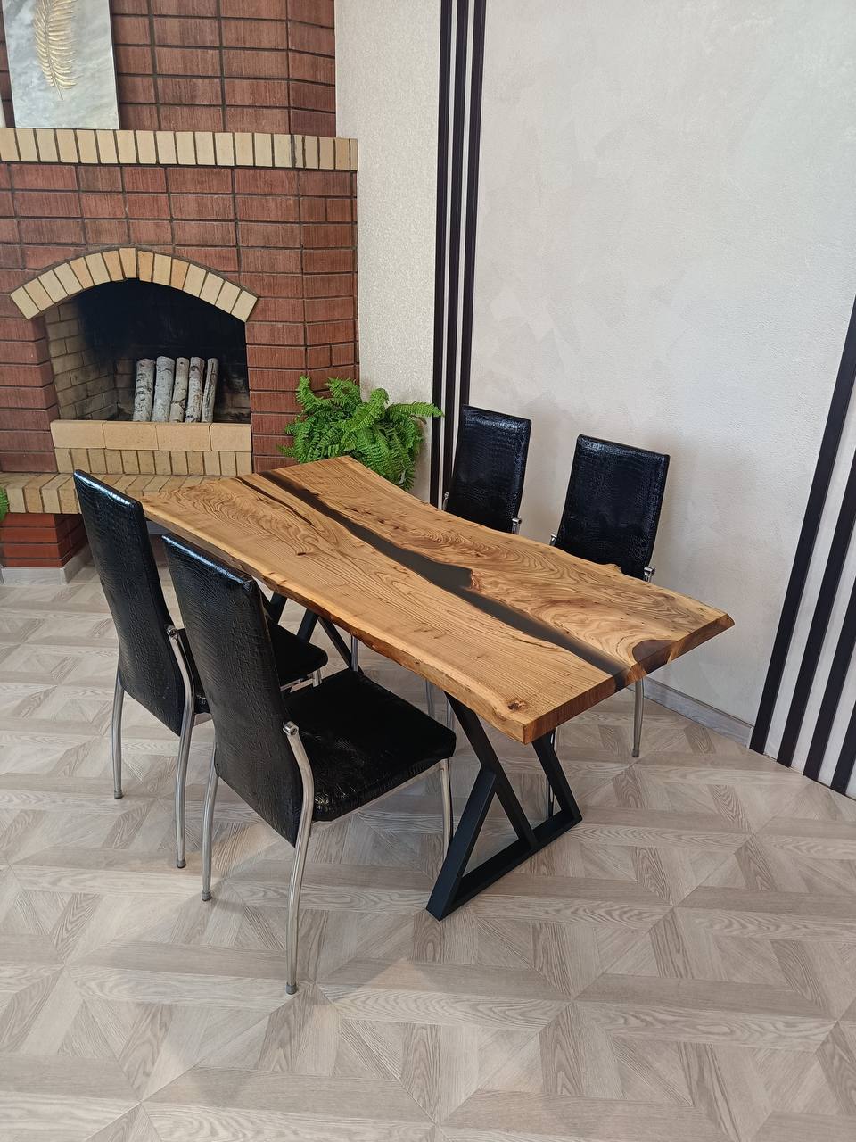 Черная эпоксидная смола добавляет поверхности глубину и элегантность, создавая эффект прозрачного покрытия, которое позволяет насладиться красотой натурального материала.
